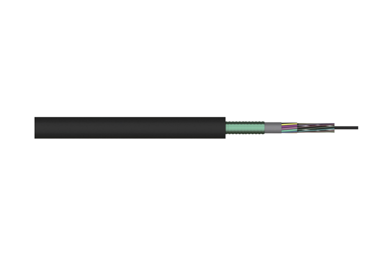 双面覆膜皱纹钢带纵包,并与 PE 护套紧密粘结,既确保了光缆的径向防潮又增强了光缆耐侧压力